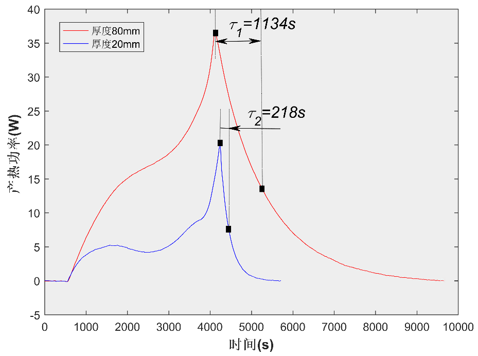 由于厚度不同的電池在容量上難以一致,因此本文選用兩款容量不同、大面面積相似、而厚度分別為20mm和80mm的磷酸鐵鋰電池(#1和#2),進(jìn)行1C恒流放電實(shí)驗(yàn)。理論上放電過程中電池內(nèi)阻隨SOC下降而單調(diào)遞增,所以放電結(jié)束時刻電池產(chǎn)熱功率應(yīng)達(dá)到最大值。但等溫量熱儀測量存在的熱滯后效應(yīng)導(dǎo)致放電結(jié)束后熱功率曲線需要經(jīng)過一定時間才能衰減為零。此處定義放電結(jié)束后功率從峰值衰減至峰值1/e的時間τ為熱滯后時間常數(shù)。τ的大小與電池至加熱片之間非穩(wěn)態(tài)傳熱的時間常數(shù)相關(guān)。如圖2所示,對于厚度為80mm的#2電池,τ?=1134,明顯大于#1電池的計算結(jié)果(τ?=218),說明電池厚度增加會顯著影響電池產(chǎn)熱測量的動態(tài)響應(yīng),這可能是由于電池?zé)崛莺蛢?nèi)部熱阻都與厚度正相關(guān)。