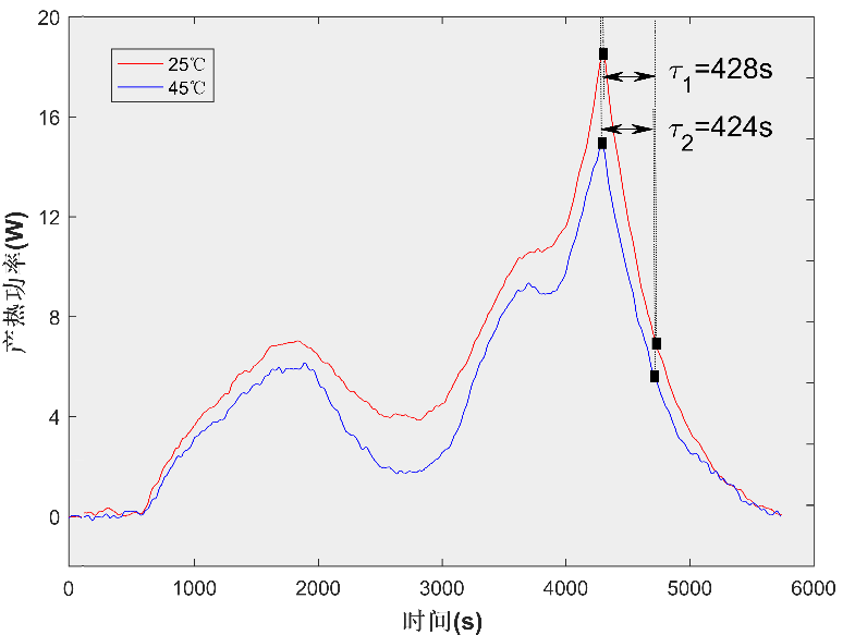 不同工作溫度下電池產(chǎn)熱特性存在差異。如圖4,在45℃條件下#3電池產(chǎn)熱功率略小于25℃下的結(jié)果,但兩者的熱滯后時間常數(shù)基本一致。可以初步認(rèn)為溫度與熱滯后沒有明顯關(guān)聯(lián)性,這可能是由于溫度小幅度變化對系統(tǒng)傳熱特性幾乎沒有影響。