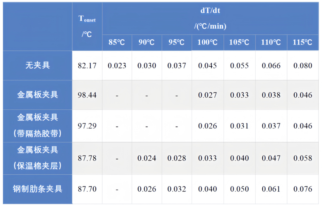 在上述實(shí)驗(yàn)過程中,電池在高溫下內(nèi)部產(chǎn)氣易發(fā)生鼓脹,通常需要使用夾具固定溫度傳感器,防止由于傳感器虛接或脫落導(dǎo)致測溫異常,確保測定數(shù)據(jù)的準(zhǔn)確性。然而,夾具存在一定的熱惰性,實(shí)驗(yàn)過程中可能會(huì)吸收電池釋放的部分熱量,導(dǎo)致電池溫升速率的檢測結(jié)果偏低,自放熱起始溫度Tonset等測定結(jié)果滯后。