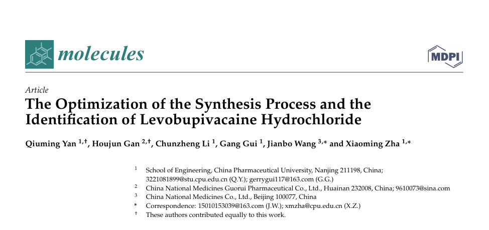 中國藥科大學工學院查曉明教授團隊在Journal | [J] MoleculesIF:4.2)發(fā)表題為The Optimization of the Synthesis Process and the Identification of Levobupivacaine Hydrochloride論文,該成果由中國藥科大學工學院、國藥集團國瑞藥業(yè)有限公司及中國民族醫(yī)藥股份有限公司等機構聯(lián)合支持。
