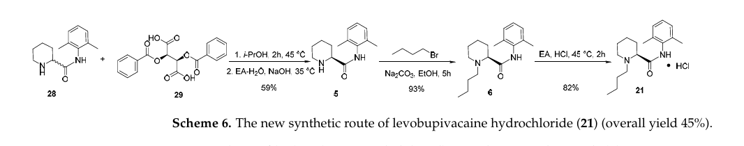 本研究從起始原料的可用性和成本效益、操作簡便性、綠色環(huán)保、設備可及性、工業(yè)化可行性、優(yōu)化的手性合成和安全性等維度考慮,優(yōu)化和改進了一種更可行的鹽酸左布比卡因(21)合成工藝(Scheme 6),這種新方法能克服現(xiàn)有方法的復雜性和高成本,有利于促進大規(guī)模工業(yè)化生產(chǎn)。