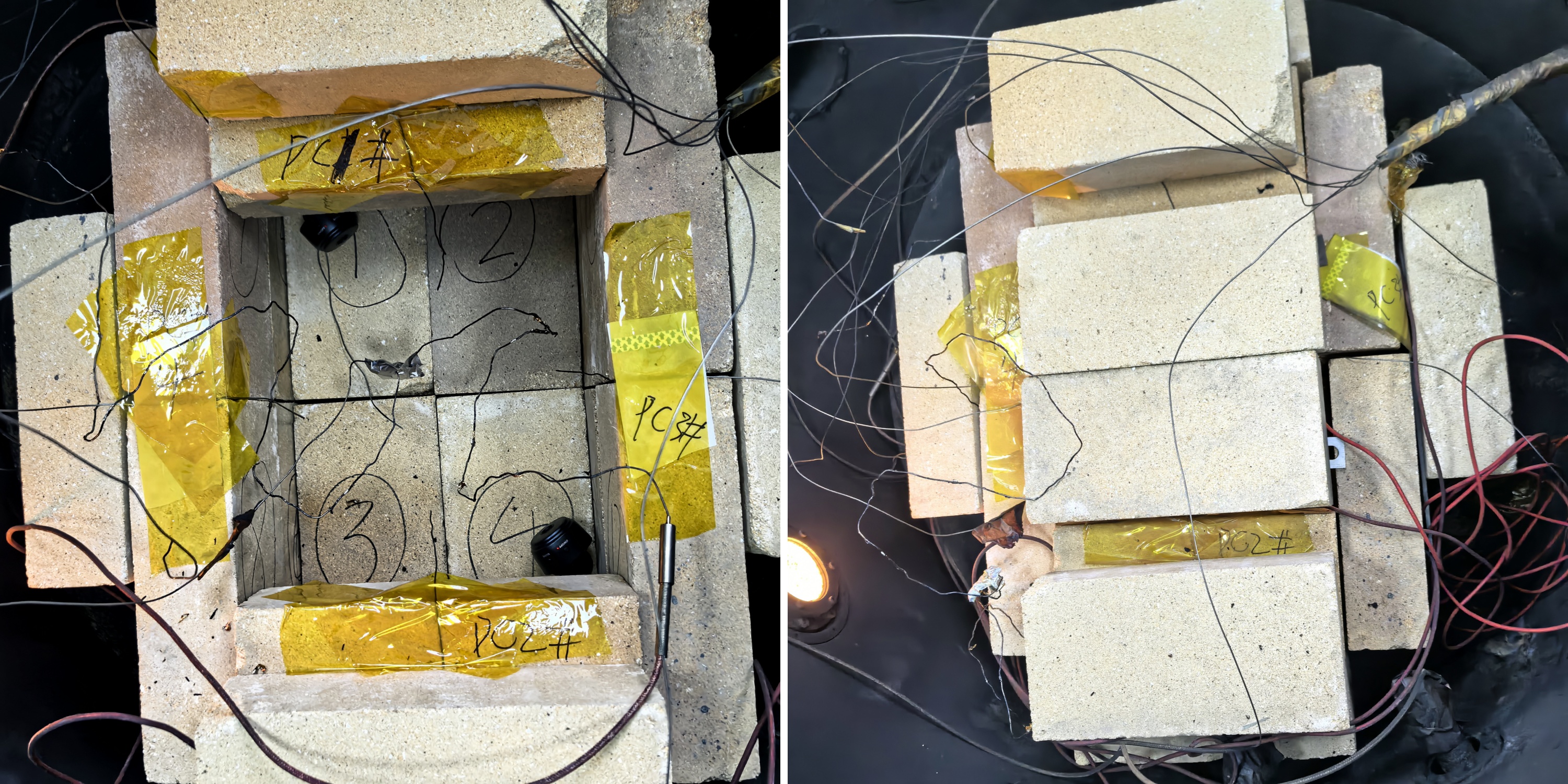 在實驗過程中,磚塊將會如圖3所示進行固定,保證磚塊將電池完全包裹,從而全面的評價電池爆炸的危害。并在內部加裝了攝像頭與熱電偶進行監(jiān)測。