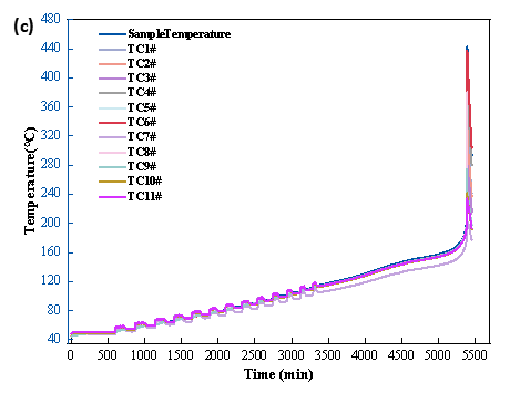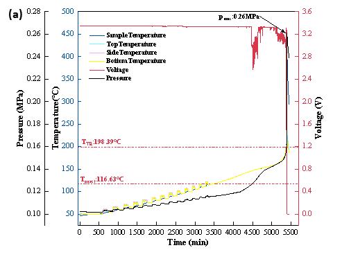 圖3 BAC-800B電池?zé)崾Э?a)溫度&電壓曲線、(b)溫升速率-溫度曲線和(c)樣品熱電偶及附加熱電偶溫升曲線