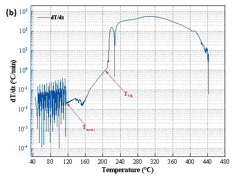 圖4 BAC-420A電池?zé)崾Э?a)溫度&電壓曲線、(b)溫升速率-溫度曲線和(c)樣品熱電偶及附加熱電偶溫升曲線